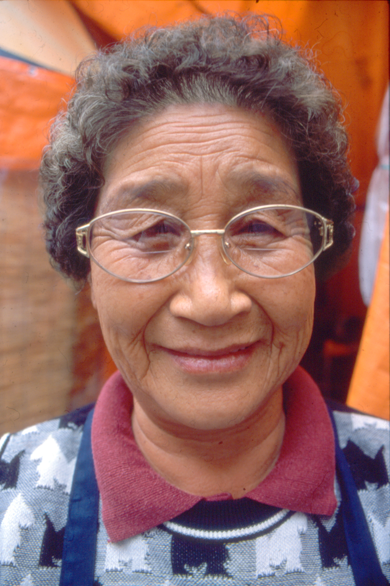 The tent is cool, and sizably larger than it had appeared from the outside. Melissa and I enter a bit bashfully, hunched low under the canopy, and our heads bob up and down like yo-yos as we bow to greet each ajuma. We're immediately ushered to the best slice of shade, right in the center, and handed two miniature yogurt drinks in plastic bottles. The ajumas all shift positions, rearranging themselves to accommodate our entrance into their world, and Melissa and I fold our legs beneath us, attempting to take up as little space as possible, and still manage a modicum of comfort. When everyone is settled, there's a short, semi-uncomfortable silence, then they all speak at once, the ajumas stumbling over the English they haven't studied since high school.